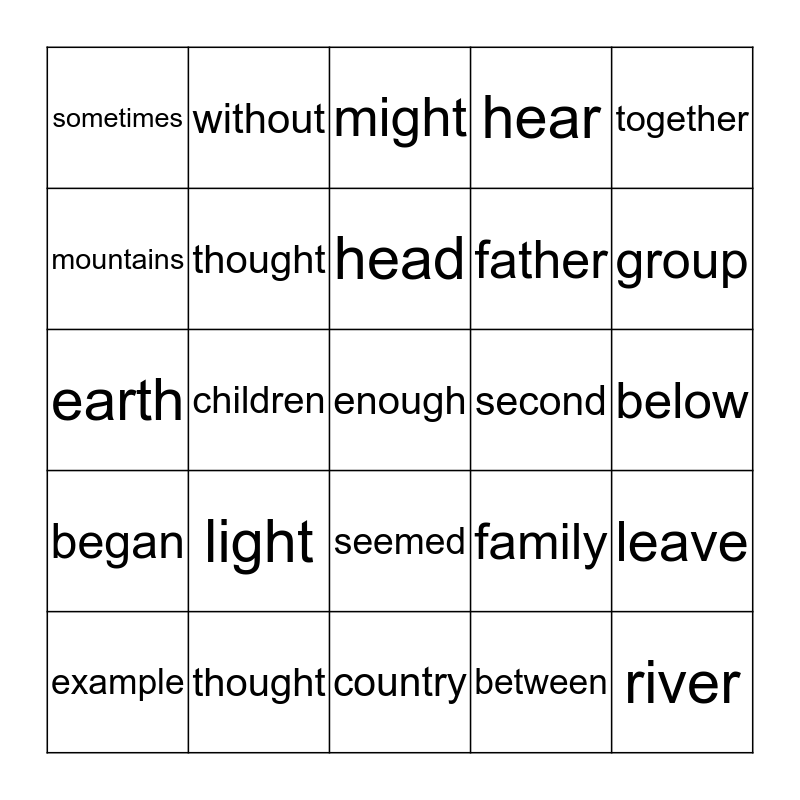 This bingo card has a free space and 24 words: light, thought, head, example, together, sometimes, mountains, without, second, seemed, father, earth, family, leave, thought, between, below, might, group, children, river, began, hear and country.