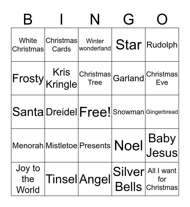 This bingo card has a free space and 24 words: Mistletoe, Tinsel, Christmas Tree, Joy to the World, Rudolph, White Christmas, Frosty, Christmas Cards, Snowman, Presents, Garland, Santa, Noel, Baby Jesus, Kris Kringle, Silver Bells, Gingerbread, Winter wonderland, Christmas Eve, Dreidel, All I want for Christmas, Menorah, Star and Angel.