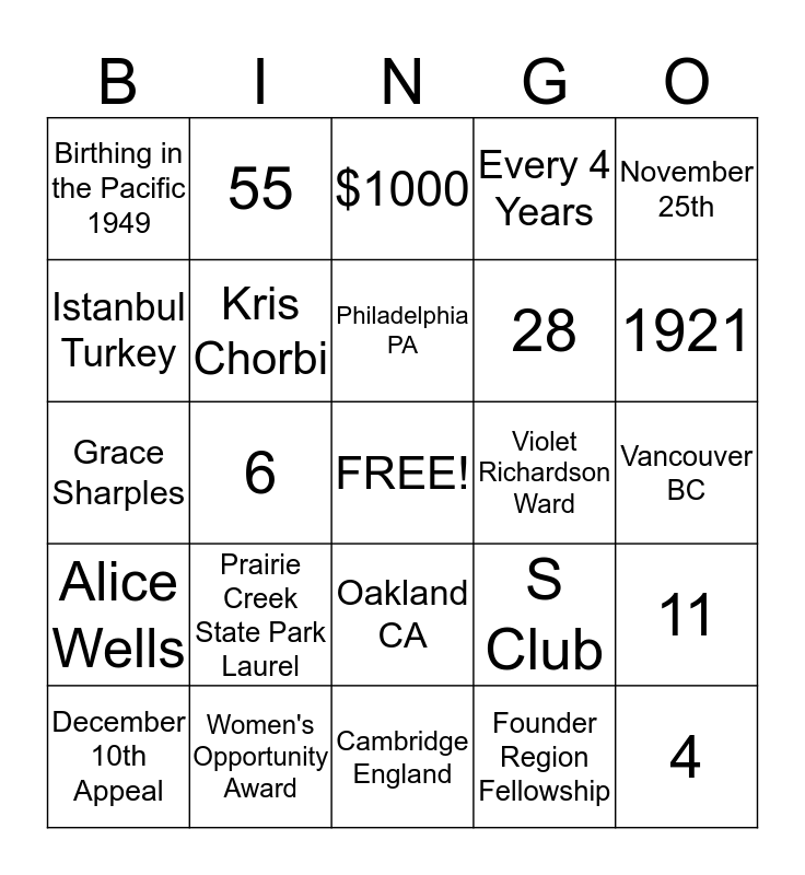 This bingo card has a free space and 28 words: 11, Cheri Fleming, 28, Founder Region Fellowship, Istanbul Turkey, $1000, 55, Alice Wells, Violet Richardson Ward, December 10th Appeal, Grace Sharples, Every 4 Years, Women's Opportunity Award, Cambridge England, 1921, Educate to Lead, Prairie Creek State Park Laurel, Kris Chorbi, Philadelphia PA, Oakland CA, Birthing in the Pacific 1949, Dona Gaddis-Wolf, 4, 6, Vancouver BC, S Club, November 25th and Acorns.