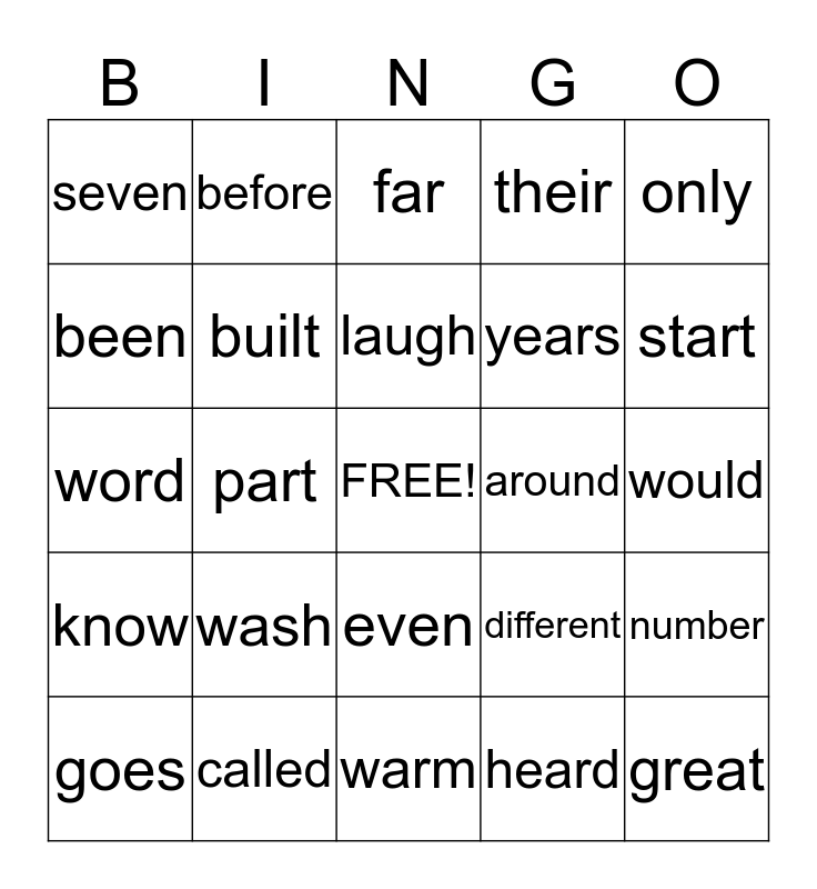 This bingo card has a free space and 24 words: wash, called, laugh, goes, only, seven, been, before, around, even, years, word, different, number, built, heard, would, far, start, part, great, know, their and warm.