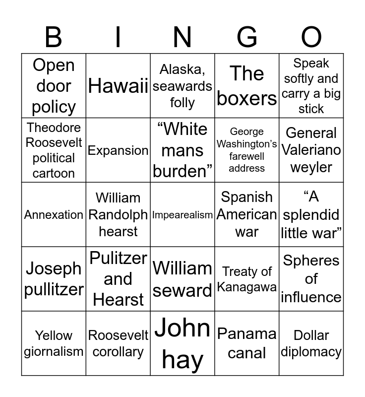 This bingo card has a free space and 24 words: Yellow giornalism, Pulitzer and Hearst, “White mans burden”, Panama canal, Speak softly and carry a big stick, Open door policy, Hawaii, Alaska, seawards folly, Spanish American war, “A splendid little war”, Annexation, Expansion, Treaty of Kanagawa, Spheres of influence, Theodore Roosevelt political cartoon, Roosevelt corollary, John hay, The boxers, General Valeriano weyler, Joseph pullitzer, William Randolph hearst, William seward, George Washington’s farewell address and Dollar diplomacy.