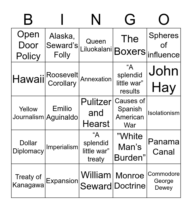 This bingo card has a free space and 24 words: Imperialism, Expansion, Annexation, Treaty of Kanagawa, Spheres of influence, Open Door Policy, Hawaii, Alaska, Seward’s Folly, Causes of Spanish American War, “A splendid little war” treaty, “A splendid little war” results, Yellow Journalism, ”White Man’s Burden”, Panama Canal, Roosevelt Corollary, Monroe Doctrine, Isolationism, Queen Liluokalani, John Hay, Emilio Aguinaldo, Commodore George Dewey, Dollar Diplomacy, The Boxers and William Seward.