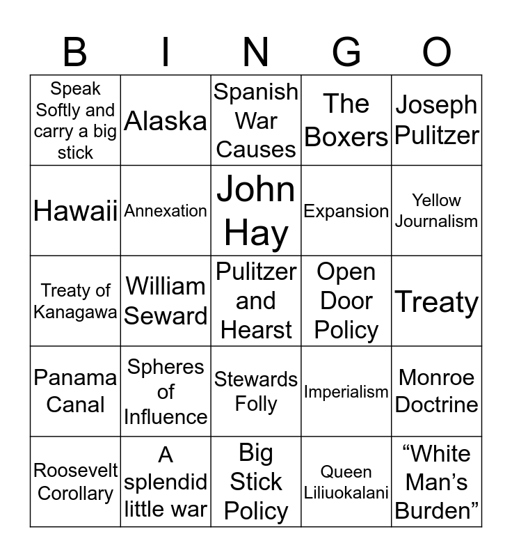 This bingo card has 25 words: Spheres of Influence, Big Stick Policy, John Hay, Roosevelt Corollary, Joseph Pulitzer, Speak Softly and carry a big stick, Hawaii, Alaska, Open Door Policy, Stewards Folly, Expansion, Treaty of Kanagawa, Imperialism, Monroe Doctrine, Annexation, “White Man’s Burden”, Treaty, Spanish War Causes, Yellow Journalism, William Seward, Pulitzer and Hearst, A splendid little war, Panama Canal, The Boxers and Queen Liliuokalani.