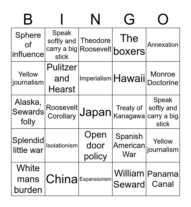 This bingo card has 25 words: Isolationism, Expansionism, Imperialism, White mans burden, Annexation, Sphere of influence, Yellow journalism, Speak softly and carry a big stick, Treaty of Kanagawa, Open door policy, Hawaii, Alaska, Sewards folly, Spanish American War, Yellow journalism, Pulitzer and Hearst, Panama Canal, Speak softly and carry a big stick, Theodore Roosevelt, Monroe Doctorine, Roosevelt Corollary, Japan, China, Splendid little war, The boxers and William Seward.