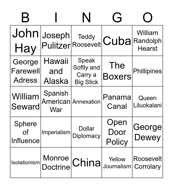 This bingo card has a free space and 24 words: Imperialism, Monroe Doctrine, Speak Softly and Carry a Big Stick, Isolationism, William Randolph Hearst, John Hay, George Farewell Adress, Joseph Pulitzer, Panama Canal, Dollar Diplomacy, The Boxers, William Seward, Open Door Policy, George Dewey, Hawaii and Alaska, Yellow Journalism, Queen Liluokalani, Teddy Roosevelt, Phillipines, Spanish American War, Roosevelt Corrolary, Sphere of Influence, Cuba and China.