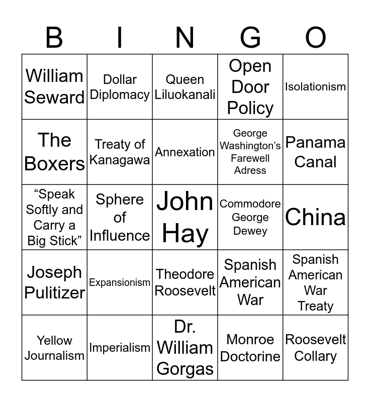 This bingo card has a free space and 24 words: Expansionism, Imperialism, Annexation, Yellow Journalism, Isolationism, William Seward, The Boxers, Dollar Diplomacy, Commodore George Dewey, Theodore Roosevelt, George Washington’s Farewell Adress, “Speak Softly and Carry a Big Stick”, Spanish American War, Spanish American War Treaty, Treaty of Kanagawa, Monroe Doctorine, China, Queen Liluokanali, Panama Canal, Sphere of Influence, Roosevelt Collary, Joseph Pulitizer, Open Door Policy and Dr. William Gorgas.
