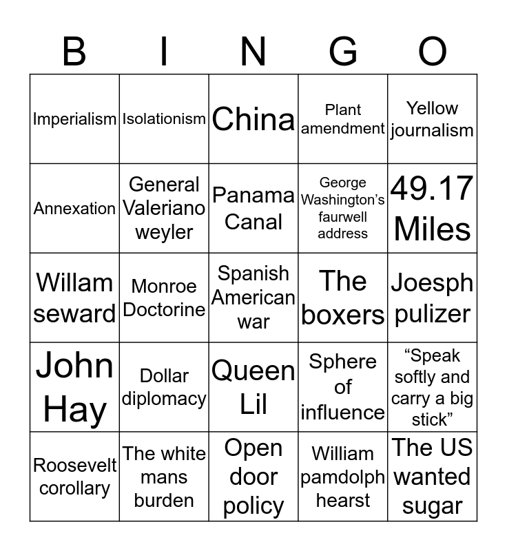 This bingo card has a free space and 24 words: Dollar diplomacy, The white mans burden, Panama Canal, Roosevelt corollary, Yellow journalism, Imperialism, Annexation, Isolationism, The boxers, Queen Lil, George Washington’s faurwell address, Willam seward, Sphere of influence, “Speak softly and carry a big stick”, General Valeriano weyler, William pamdolph hearst, Joesph pulizer, China, 49.17 Miles, Monroe Doctorine, The US wanted sugar, John Hay, Plant amendment and Open door policy.