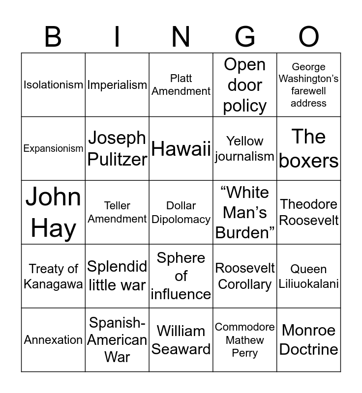 This bingo card has a free space and 24 words: Splendid little war, Spanish-American War, Hawaii, Annexation, George Washington’s farewell address, Isolationism, Expansionism, Imperialism, “White Man’s Burden”, Sphere of influence, Yellow journalism, John Hay, Roosevelt Corollary, Queen Liliuokalani, Joseph Pulitzer, Commodore Mathew Perry, Theodore Roosevelt, Platt Amendment, The boxers, Teller Amendment, Monroe Doctrine, Treaty of Kanagawa, Open door policy and William Seaward.