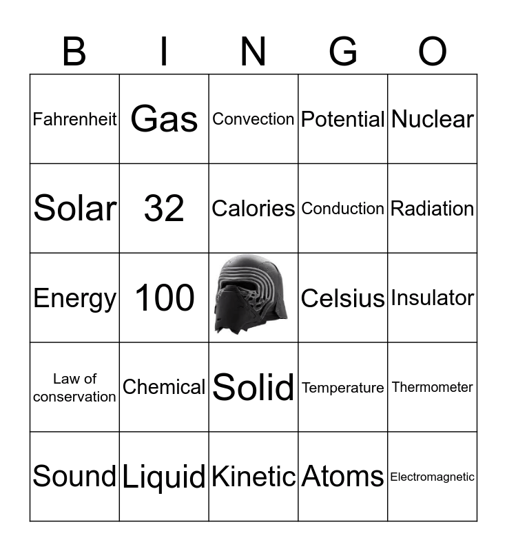 This bingo card has a free space and 24 words: Chemical, Liquid, Calories, Sound, Nuclear, Fahrenheit, Solar, Gas, Celsius, Solid, Conduction, Energy, Temperature, Thermometer, 32, Atoms, Insulator, Convection, Radiation, 100, Electromagnetic, Law of conservation, Potential and Kinetic.