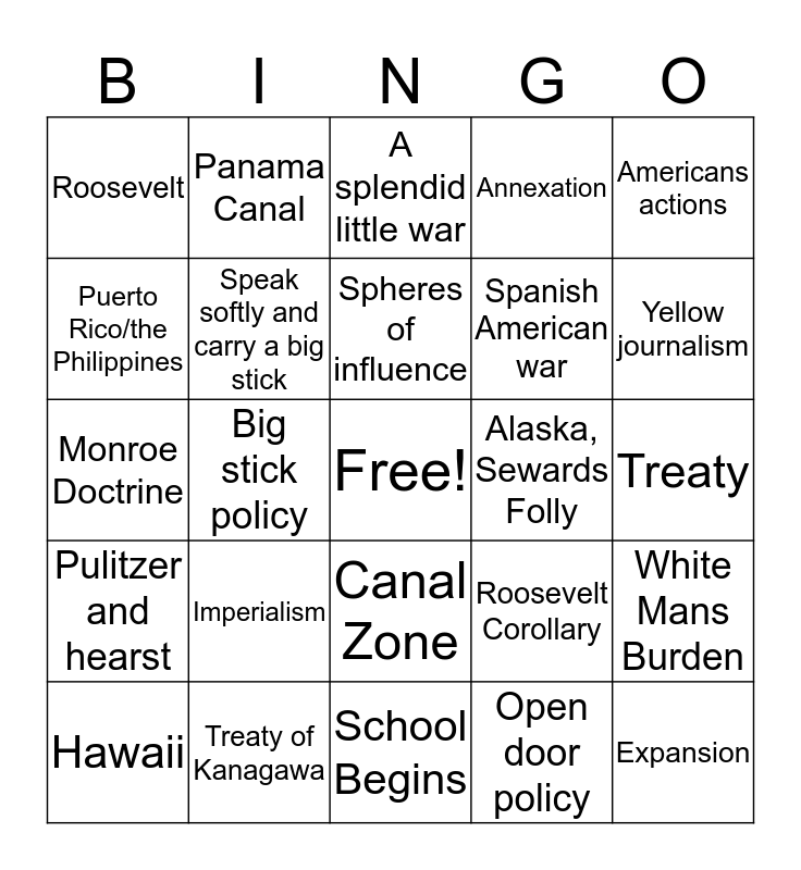 This bingo card has a free space and 24 words: Imperialism, Treaty of Kanagawa, Spheres of influence, Hawaii, Americans actions, Roosevelt, Puerto Rico/the Philippines, Panama Canal, Alaska, Sewards Folly, Canal Zone, Spanish American war, Monroe Doctrine, Roosevelt Corollary, White Mans Burden, Speak softly and carry a big stick, Open door policy, Treaty, A splendid little war, Yellow journalism, Big stick policy, Expansion, Pulitzer and hearst, Annexation and School Begins.