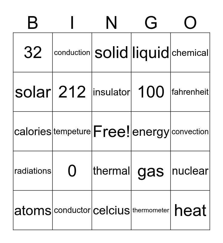 This bingo card has a free space and 24 words: 0, conductor, insulator, atoms, chemical, 32, solar, conduction, energy, thermal, 100, calories, gas, nuclear, 212, thermometer, convection, solid, fahrenheit, tempeture, heat, radiations, liquid and celcius.