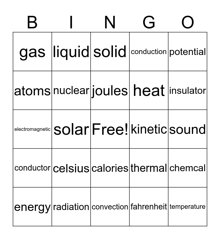 This bingo card has a free space and 24 words: energy, celsius, joules, fahrenheit, potential, gas, liquid, solid, kinetic, sound, electromagnetic, nuclear, thermal, chemcal, atoms, radiation, convection, conduction, insulator, conductor, solar, calories, heat and temperature.