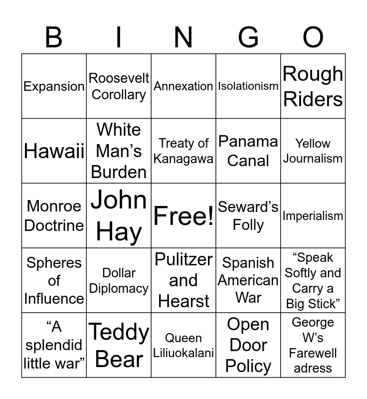 This bingo card has a free space and 24 words: Dollar Diplomacy, Teddy Bear, Treaty of Kanagawa, “A splendid little war”, Rough Riders, Expansion, Hawaii, Roosevelt Corollary, Seward’s Folly, Pulitzer and Hearst, Panama Canal, Monroe Doctrine, Spanish American War, “Speak Softly and Carry a Big Stick”, White Man’s Burden, Open Door Policy, Imperialism, Annexation, Yellow Journalism, John Hay, George W’s Farewell adress, Spheres of Influence, Isolationism and Queen Liliuokalani.