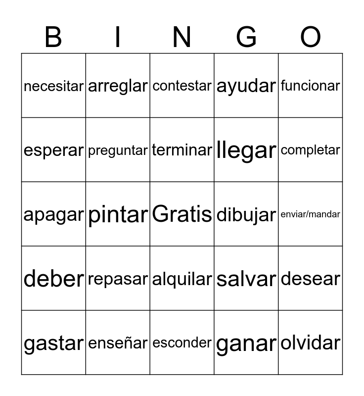 This bingo card has a free space and 29 words: gastar, manejar, pintar, aprender, necesitar, contestar, preguntar, repasar, dibujar, enseñar, enviar/mandar, olvidar, esconder, ganar, completar, charlar, alquilar, deber, funcionar, apagar, salvar, asistir, llegar, esperar, ayudar, arreglar, desear, terminar and descansar.