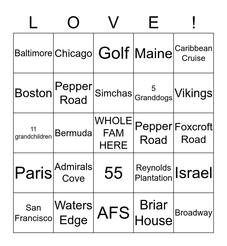 This bingo card has a free space and 24 words: Admirals Cove, Waters Edge, Simchas, San Francisco, Caribbean Cruise, Baltimore, Boston, Chicago, Pepper Road, 55, 5 Granddogs, 11 grandchildren, Reynolds Plantation, Israel, Pepper Road, Briar House, Foxcroft Road, Golf, Vikings, Bermuda, Broadway, Paris, Maine and AFS.