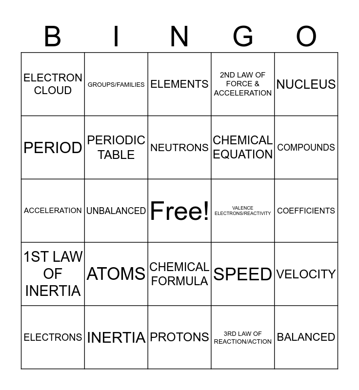 This bingo card has a free space and 25 words: ATOMS, PROTONS, NEUTRONS, ELECTRONS, NUCLEUS, ELECTRON CLOUD, PERIOD, GROUPS/FAMILIES, VALENCE ELECTRONS/REACTIVITY, CHEMICAL FORMULA, CHEMICAL EQUATION, ACCELERATION, SPEED, VELOCITY, PERIODIC TABLE, SUBSCRIPTS, COEFFICIENTS, ELEMENTS, COMPOUNDS, UNBALANCED, BALANCED, INERTIA, 1ST LAW OF INERTIA, 2ND LAW OF FORCE & ACCELERATION and 3RD LAW OF REACTION/ACTION.