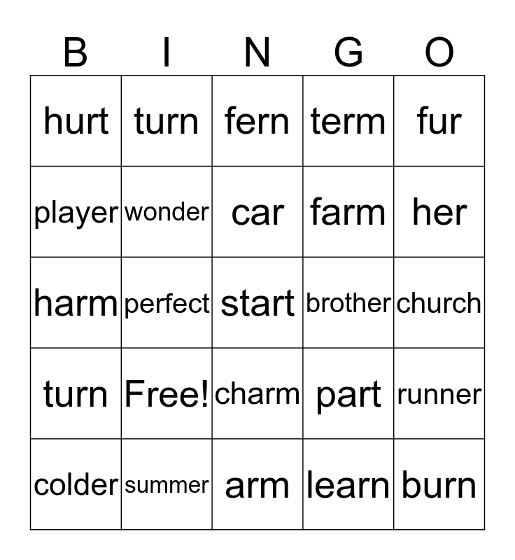 This bingo card has 25 words: Free!, arm, car, colder, fur, hurt, player, turn, brother, charm, farm, harm, part, runner, wonder, burn, church, fern, her, perfect, start, summer, turn, term and learn.