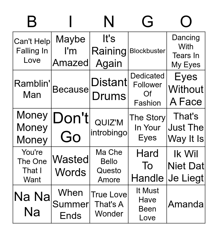 This bingo card has a free space and 33 words: U Can't Touch This, Selling The Drama, Don't Go, Hold Me Now, You're The One That I Want, Because, Dancing With Tears In My Eyes, Na Na Na, Maybe I'm Amazed, A Change Is Gonna Come, Distant Drums, It's Raining Again, Strangers In The Night, Girl On Fire, The Story In Your Eyes, Eyes Without A Face, When Summer Ends, Money Money Money, Wasted Words, Hard To Handle, Ma Che Bello Questo Amore, Girls Just Want To Have Fun, Can't Help Falling In Love, That's Just The Way It Is, True Love That's A Wonder, Amanda, Blockbuster, Dedicated Follower Of Fashion, Ramblin' Man, Ik Wil Niet Dat Je Liegt, Eternity, It Must Have Been Love and Funkin' For Jamaica.