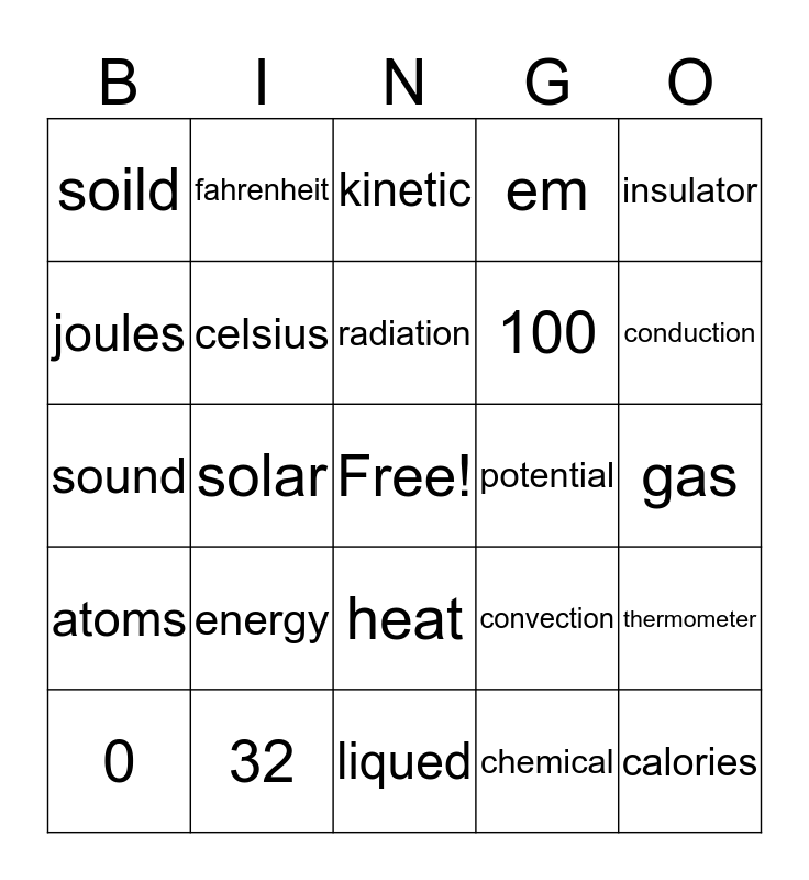 This bingo card has a free space and 24 words: energy, 32, radiation, 0, insulator, soild, joules, fahrenheit, potential, heat, 100, sound, convection, thermometer, celsius, chemical, gas, kinetic, conduction, solar, calories, atoms, em and liqued.