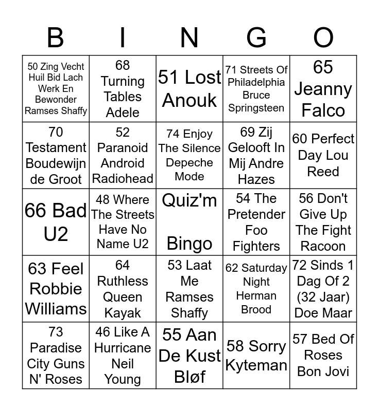 This bingo card has a free space and 30 words: 46 Like A Hurricane Neil Young, 47 Earth Song Michael Jackson, 48 Where The Streets Have No Name U2, 49 De Vondeling Van Ameland Boudewijn de Groot, 50 Zing Vecht Huil Bid Lach Werk En Bewonder Ramses Shaffy, 51 Lost Anouk, 52 Paranoid Android Radiohead, 53 Laat Me Ramses Shaffy, 54 The Pretender Foo Fighters, 55 Aan De Kust Bløf, 56 Don't Give Up The Fight Racoon, 57 Bed Of Roses Bon Jovi, 58 Sorry Kyteman, 59 Kayleigh Marillion, 60 Perfect Day Lou Reed, 61 Graceland Paul Simon, 62 Saturday Night Herman Brood, 63 Feel Robbie Williams, 64 Ruthless Queen Kayak, 65 Jeanny Falco, 66 Bad U2, 67 Halo Of Flies Alice Cooper, 68 Turning Tables Adele, 69 Zij Gelooft In Mij Andre Hazes, 70 Testament Boudewijn de Groot, 71 Streets Of Philadelphia Bruce Springsteen, 72 Sinds 1 Dag Of 2 (32 Jaar) Doe Maar, 73 Paradise City Guns N' Roses, 74 Enjoy The Silence Depeche Mode and 75 Uprising Muse.