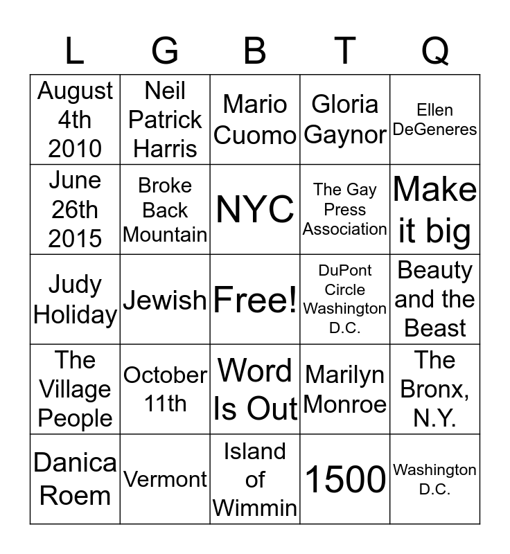 This bingo card has a free space and 24 words: October 11th, Vermont, NYC, Danica Roem, Ellen DeGeneres, August 4th 2010, June 26th 2015, Neil Patrick Harris, DuPont Circle Washington D.C., Word Is Out, The Gay Press Association, Judy Holiday, Marilyn Monroe, The Bronx, N.Y., Broke Back Mountain, 1500, Beauty and the Beast, Mario Cuomo, Make it big, Jewish, Washington D.C., The Village People, Gloria Gaynor and Island of Wimmin.