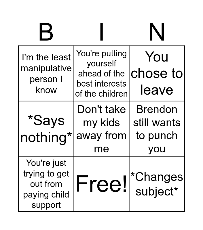 This bingo card has 10 words: Free!, You chose to leave, I'm the least manipulative person I know, Don't take my kids away from me, *Says nothing*, You're just trying to get out from paying child support, You're putting yourself ahead of the best interests of the children, Nate won't be able to handle the upheaval, Brendon still wants to punch you and *Changes subject*.