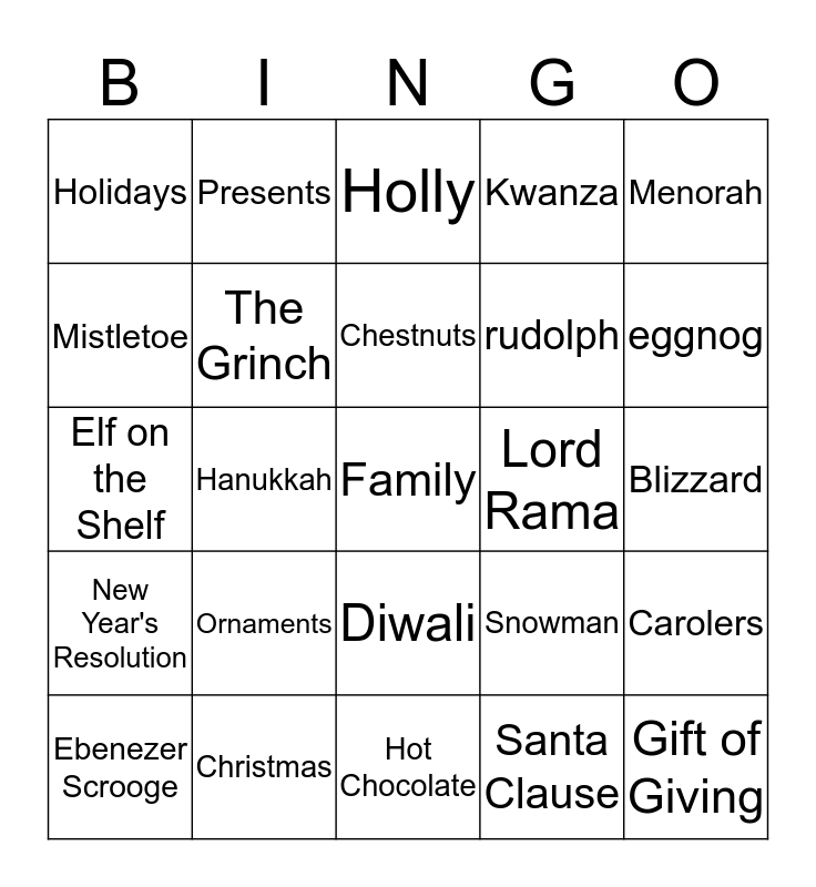 This bingo card has 25 words: Ornaments, Hot Chocolate, Chestnuts, Ebenezer Scrooge, Menorah, Holidays, Mistletoe, Presents, Lord Rama, Diwali, rudolph, Elf on the Shelf, Snowman, Carolers, The Grinch, Gift of Giving, Blizzard, Holly, eggnog, Hanukkah, Family, Christmas, New Year's Resolution, Kwanza and Santa Clause.