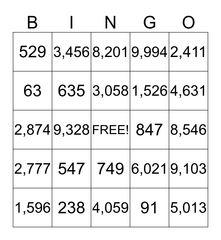 This bingo card has a free space and 24 words: 547, 238, 3,058, 1,596, 2,411, 529, 63, 3,456, 847, 749, 1,526, 2,874, 6,021, 9,103, 635, 91, 8,546, 8,201, 4,631, 9,328, 5,013, 2,777, 9,994 and 4,059.