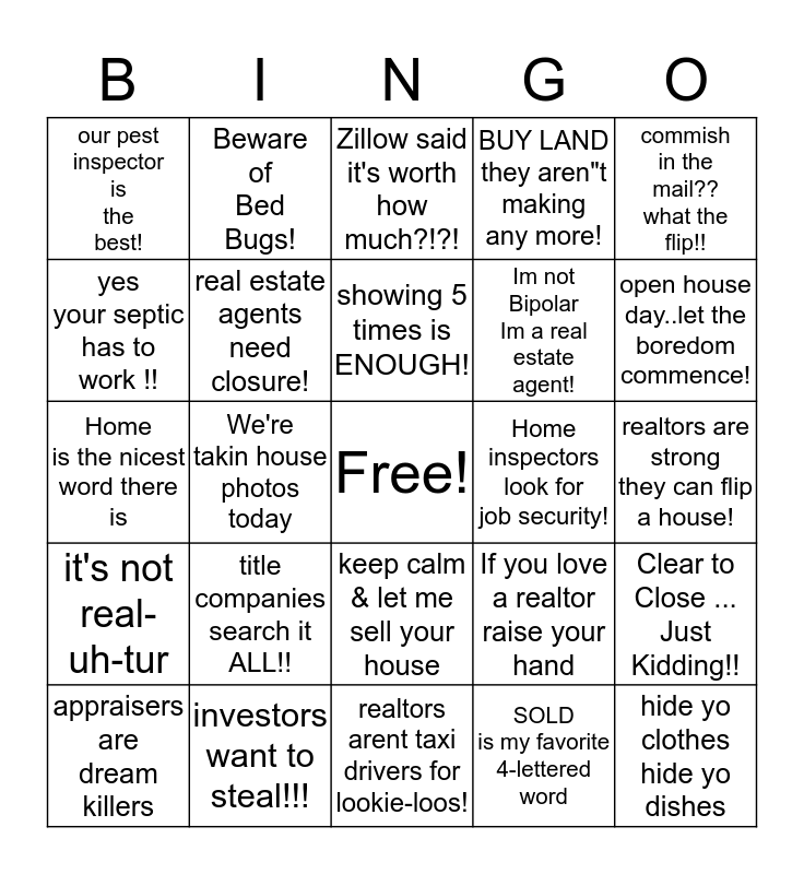 This bingo card has a free space and 24 words: title companies search it ALL!!, investors want to steal!!!, showing 5 times is ENOUGH!, appraisers are dream killers, commish in the mail?? what the flip!!, our pest inspector is the best!, yes your septic has to work !!, Beware of Bed Bugs!, Home inspectors look for job security!, keep calm & let me sell your house, Im not Bipolar Im a real estate agent!, Home is the nicest word there is, If you love a realtor raise your hand, Clear to Close ... Just Kidding!!, real estate agents need closure!, SOLD is my favorite 4-lettered word, realtors are strong they can flip a house!, Zillow said it's worth how much?!?!, open house day..let the boredom commence!, We're takin house photos today, hide yo clothes hide yo dishes, it's not real-uh-tur, BUY LAND they aren"t making any more! and realtors arent taxi drivers for lookie-loos!.