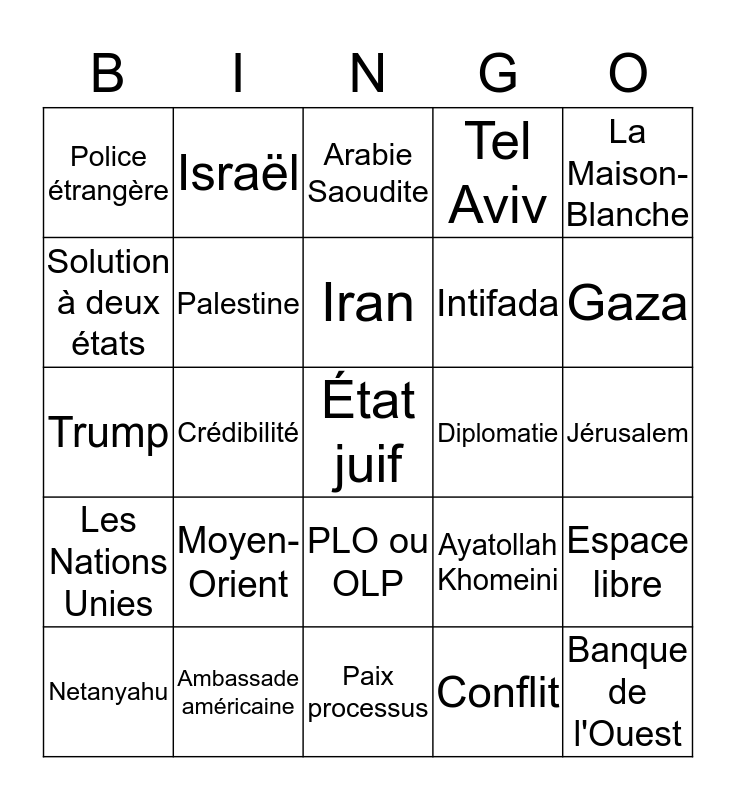 This bingo card has a free space and 24 words: Netanyahu, Moyen-Orient, Iran, Conflit, La Maison-Blanche, Police étrangère, Israël, Arabie Saoudite, Diplomatie, Jérusalem, Trump, Palestine, Ayatollah Khomeini, Espace libre, Solution à deux états, Ambassade américaine, Paix processus, Tel Aviv, Gaza, Les Nations Unies, Crédibilité, PLO ou OLP, Intifada and Banque de l'Ouest.