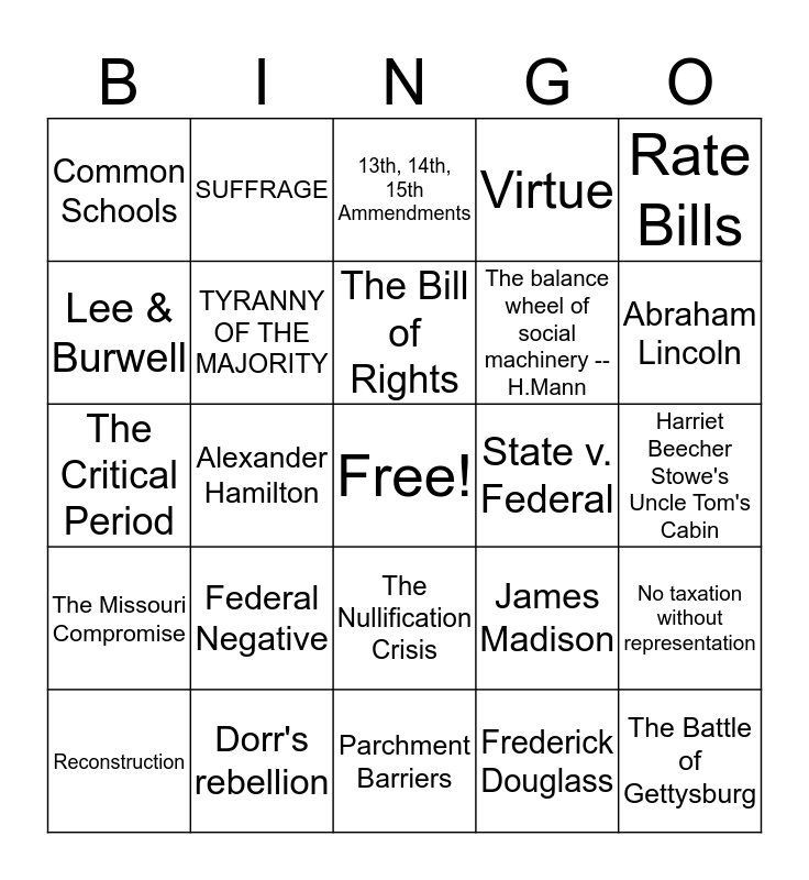 This bingo card has a free space and 24 words: Federal Negative, Dorr's rebellion, The Bill of Rights, Reconstruction, Rate Bills, Common Schools, Lee & Burwell, SUFFRAGE, State v. Federal, The Nullification Crisis, The balance wheel of social machinery --H.Mann, The Critical Period, James Madison, No taxation without representation, TYRANNY OF THE MAJORITY, Frederick Douglass, Harriet Beecher Stowe's Uncle Tom's Cabin, 13th, 14th, 15th Ammendments, Abraham Lincoln, Alexander Hamilton, The Battle of Gettysburg, The Missouri Compromise, Virtue and Parchment Barriers.