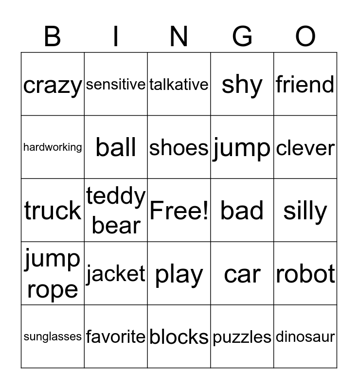 This bingo card has a free space and 24 words: jacket, favorite, shoes, sunglasses, friend, crazy, hardworking, sensitive, bad, play, jump, truck, car, robot, ball, puzzles, silly, talkative, clever, teddy bear, dinosaur, jump rope, shy and blocks.