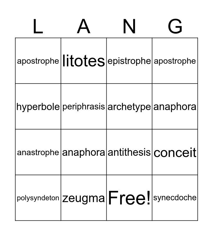 This bingo card has 19 words: antithesis, metonymy, epistrophe, synecdoche, conceit, hyperbole, Free!, apostrophe, litotes, anastrophe, anaphora, periphrasis, archetype, zeugma, polysyndeton, chaismus, apostrophe, anaphora and invective.