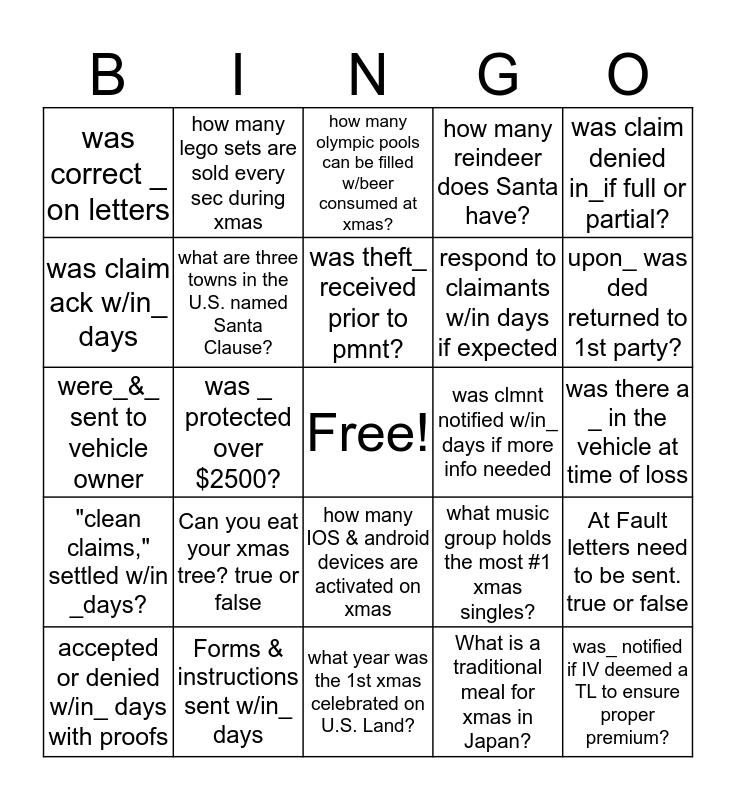 This bingo card has a free space and 24 words: Can you eat your xmas tree? true or false, Forms & instructions sent w/in_ days, was theft_ received prior to pmnt?, accepted or denied w/in_ days with proofs, was claim denied in_if full or partial?, was correct _ on letters, was claim ack w/in_ days, how many lego sets are sold every sec during xmas, was clmnt notified w/in_ days if more info needed, how many IOS & android devices are activated on xmas, respond to claimants w/in days if expected, were_&_ sent to vehicle owner, what music group holds the most #1 xmas singles?, At Fault letters need to be sent. true or false, what are three towns in the U.S. named Santa Clause?, What is a traditional meal for xmas in Japan?, was there a _ in the vehicle at time of loss, how many olympic pools can be filled w/beer consumed at xmas?, upon_ was ded returned to 1st party?, was _ protected over $2500?, was_ notified if IV deemed a TL to ensure proper premium?, "clean claims," settled w/in _days?, how many reindeer does Santa have? and what year was the 1st xmas celebrated on U.S. Land?.