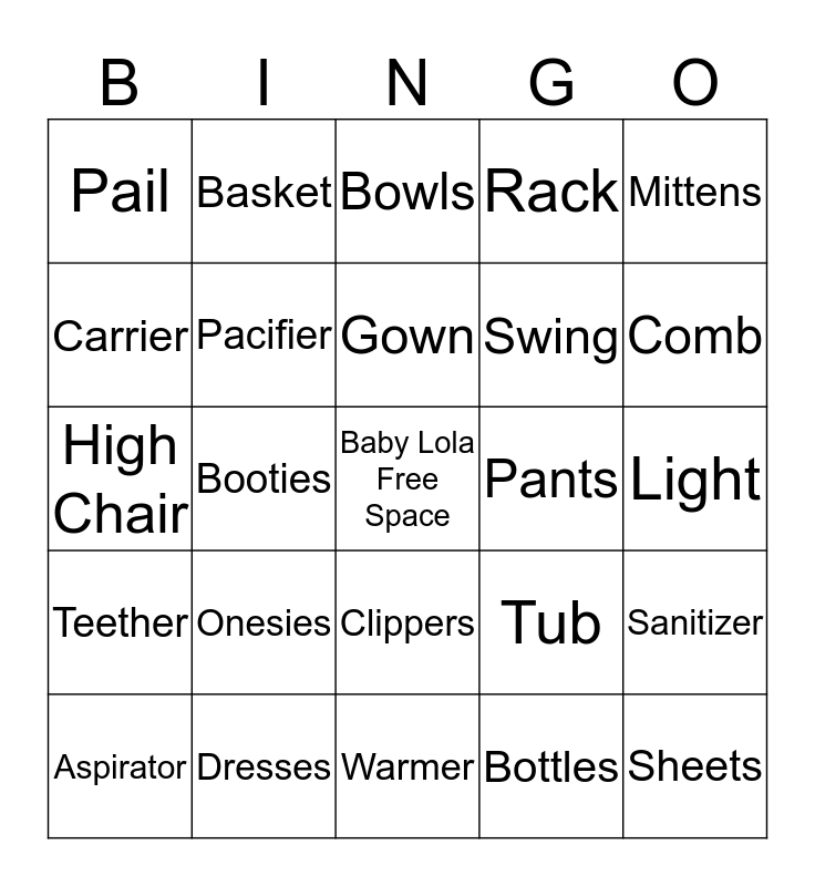 This bingo card has a free space and 53 words: Diapers, Sheets, Wipes, Bottles, Onesies, Bibs, Basket, Blanket, Carrier, Pillow, Pacifier, Cream, Sanitizer, Tub, Lotion, Aspirator, Gown, Pants, Caps, Mittens, Booties, Socks, Swing, Pail, Books, Dresses, Headbands, Towel, Swaddle, Comb, Bumbo, Shampoo, Boppy, Leggings, Tights, Pajamas, Rack, Warmer, Bowls, Cups, Spoons, Toys, Light, Mobile, Thermometer, Clippers, Brush, Stroller, High Chair, Teether, Powder, Rattle and Monitor.