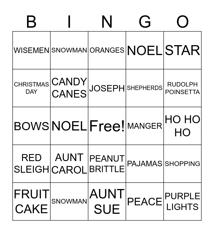 This bingo card has a free space and 51 words: RED AND GREEN, PURPLE LIGHTS, UNCLE DALE, AUNT SUE, AUNT CAROL, BOOTS, SNOWMAN, GRINCH, CHRISTMAS DAY, PEACE, CANDY CANES, NOEL, SHOPPING, PAJAMAS, LIGHTS, MARY, JOSEPH, MANGER, BABY JESUS, STAR, NOEL, PEACE, WISEMEN, SHEPHERDS, POLAR EXPRESS, DONKEY, RUDOLPH POINSETTA, CHESTNUTS, FRUIT CAKE, ORANGES, CAROLING, RED AND GREEN, ANGELS, NO SCHOOL, CHOCOLATES, SNOWMAN, WARM FIRE, FIREPLACE, CHIMNEY, SANTA, HO HO HO, RED SLEIGH, POPCORN, WREATH, ICICLES, WRAPPING PAPER, BOWS, BB GUN, HAM TURKEY, PEANUT BRITTLE and FRUIT CAKE.