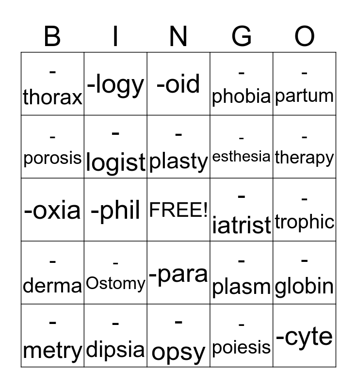 This bingo card has a free space and 24 words: -Ostomy, -dipsia, -plasty, -metry, -partum, -thorax, -porosis, -logy, -iatrist, -para, -esthesia, -oxia, -plasm, -globin, -logist, -poiesis, -trophic, -oid, -therapy, -phil, -cyte, -derma, -phobia and -opsy.