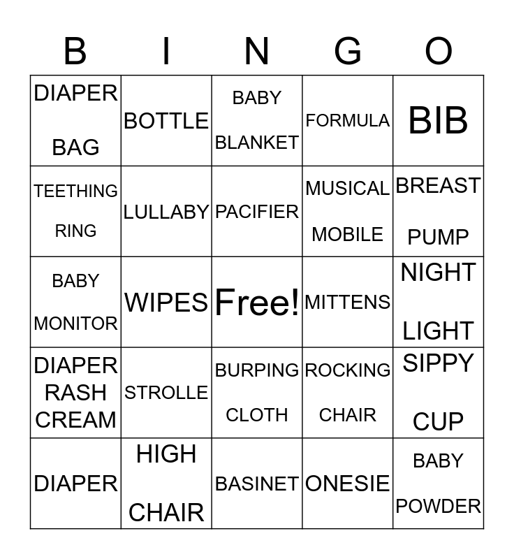 This bingo card has a free space and 24 words: STROLLE, HIGH CHAIR, PACIFIER, DIAPER, BIB, DIAPER BAG, TEETHING RING, BOTTLE, MITTENS, BURPING CLOTH, MUSICAL MOBILE, BABY MONITOR, ROCKING CHAIR, SIPPY CUP, LULLABY, ONESIE, NIGHT LIGHT, BABY BLANKET, BREAST PUMP, WIPES, BABY POWDER, DIAPER RASH CREAM, FORMULA and BASINET.