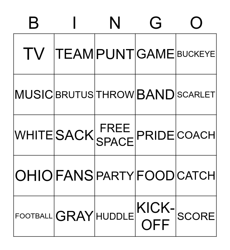 This bingo card has a free space and 34 words: PASS, KICK-OFF, TOUCH DOWN!, OSU, OHIO, BRUTUS, BUCKEYE, FOOTBALL, TEAM, RUN, THROW, PUNT, CHEER, WIN, PRIDE, SCARLET, GRAY, WHITE, FANS, FOOD, PARTY, JERSEY, TV, COACH, HUDDLE, SCORE, GAME, CAPTAIN, BAND, MUSIC, TACKLE, SACK, CATCH and WHISTLE.