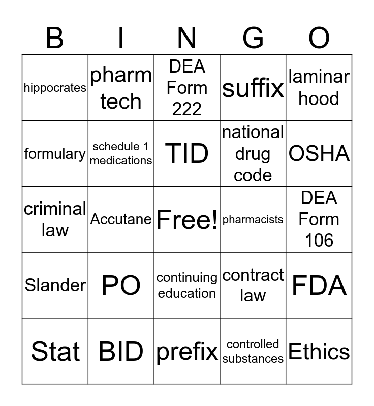 This bingo card has a free space and 24 words: PO, BID, TID, Stat, laminar hood, hippocrates, formulary, pharm tech, pharmacists, continuing education, national drug code, criminal law, contract law, FDA, schedule 1 medications, controlled substances, DEA Form 106, DEA Form 222, OSHA, Accutane, Ethics, Slander, suffix and prefix.
