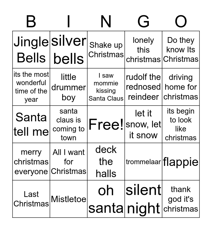 This bingo card has a free space and 24 words: All I want for Christmas, Mistletoe, I saw mommie kissing Santa Claus, Last Christmas, Do they know Its Christmas, Jingle Bells, its the most wonderful time of the year, silver bells, let it snow, let it snow, deck the halls, rudolf the rednosed reindeer, Santa tell me, trommelaar, flappie, little drummer boy, silent night, its begin to look like christmas, Shake up Christmas, driving home for christmas, santa claus is coming to town, thank god it's christmas, merry christmas everyone, lonely this christmas and oh santa.
