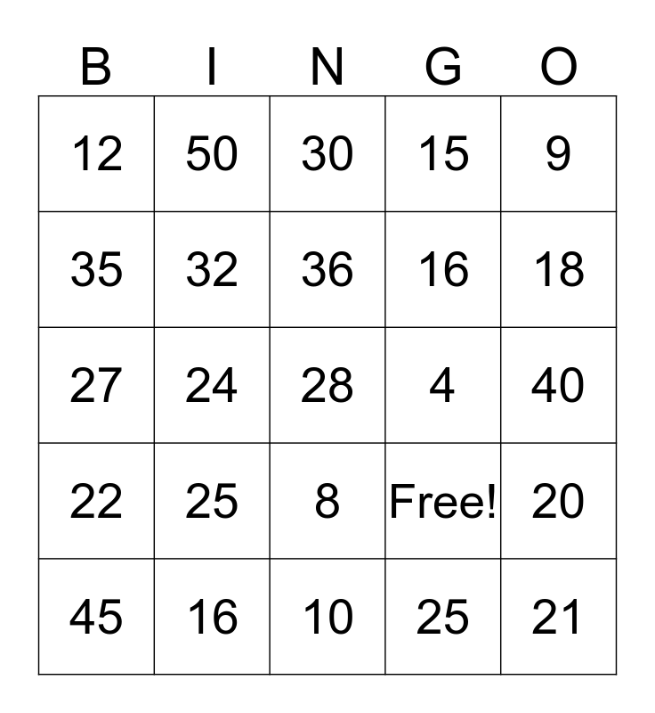 This bingo card has 25 words: 25, 10, 36, 45, 9, 12, 35, 50, 4, 8, 16, 27, Free!, 20, 32, 21, 40, 30, 18, 24, 28, 16, 22, 15 and 25.