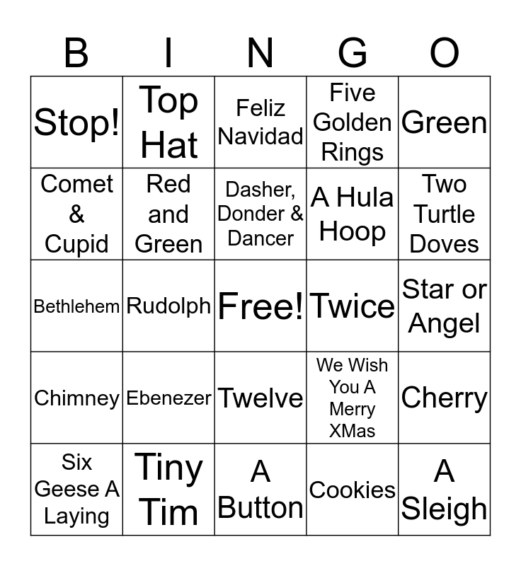 This bingo card has a free space and 24 words: Ebenezer, Tiny Tim, Dasher, Donder & Dancer, Six Geese A Laying, Green, Stop!, Comet & Cupid, Top Hat, Twice, Twelve, A Hula Hoop, Bethlehem, We Wish You A Merry XMas, Cherry, Red and Green, Cookies, Star or Angel, Feliz Navidad, Two Turtle Doves, Rudolph, A Sleigh, Chimney, Five Golden Rings and A Button.
