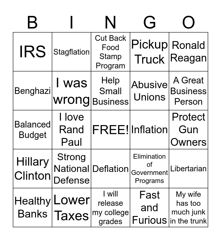 This bingo card has a free space and 24 words: Strong National Defense, Lower Taxes, Help Small Business, Healthy Banks, Ronald Reagan, IRS, Benghazi, Stagflation, Inflation, Deflation, Abusive Unions, Balanced Budget, Elimination of Government Programs, Libertarian, I was wrong, Fast and Furious, Protect Gun Owners, Cut Back Food Stamp Program, A Great Business Person, I love Rand Paul, My wife has too much junk in the trunk, Hillary Clinton, Pickup Truck and I will release my college grades.