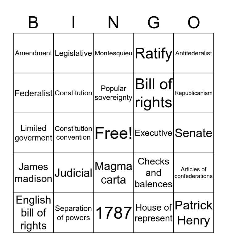 This bingo card has a free space and 24 words: Judicial, Separation of powers, Popular sovereignty, English bill of rights, Antifederalist, Amendment, Federalist, Legislative, Executive, Magma carta, Bill of rights, Limited goverment, Checks and balences, Articles of confederations, Constitution, House of represent, Senate, Montesquieu, Republicanism, Constitution convention, Patrick Henry, James madison, Ratify and 1787.