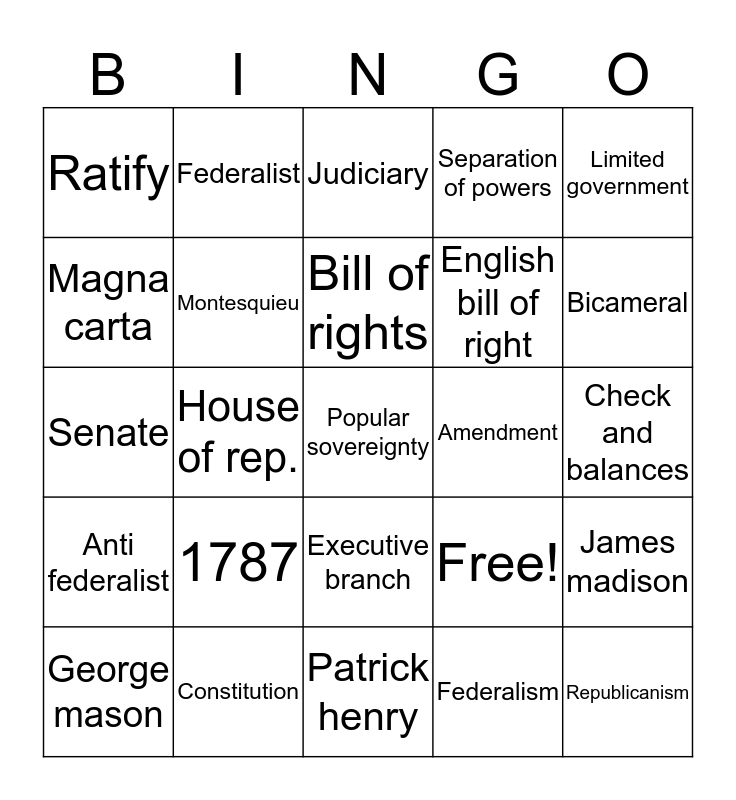This bingo card has 25 words: 1787, Patrick henry, Bill of rights, George mason, Limited government, Ratify, Magna carta, Federalist, Amendment, Executive branch, English bill of right, Senate, Free!, James madison, Montesquieu, Republicanism, Check and balances, Judiciary, Bicameral, House of rep., Popular sovereignty, Constitution, Anti federalist, Separation of powers and Federalism.