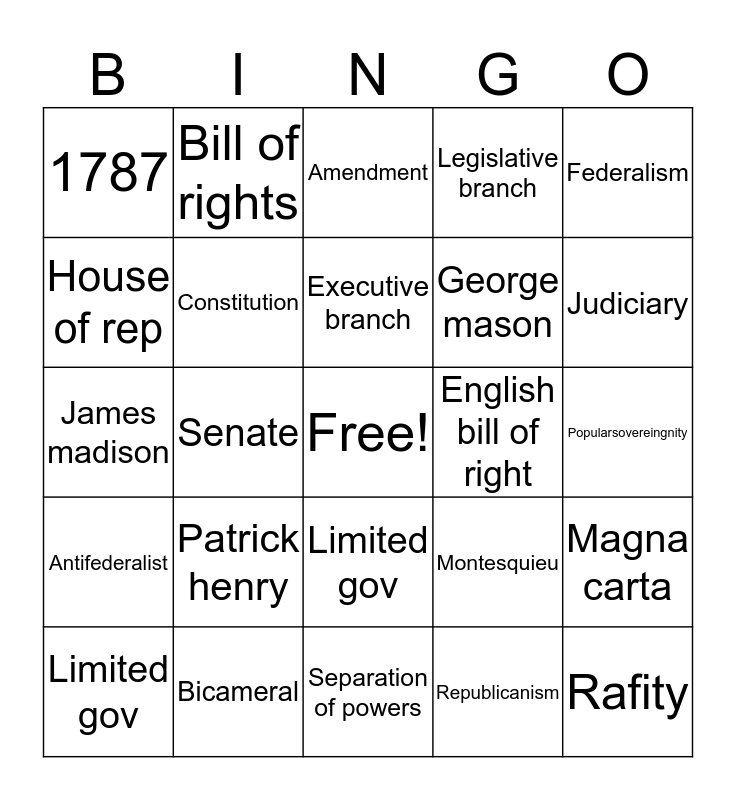 This bingo card has a free space and 24 words: Patrick henry, Bicameral, Executive branch, Limited gov, Federalism, 1787, House of rep, Bill of rights, English bill of right, Limited gov, George mason, James madison, Montesquieu, Magna carta, Constitution, Republicanism, Popularsovereingnity, Amendment, Judiciary, Senate, Rafity, Antifederalist, Legislative branch and Separation of powers.