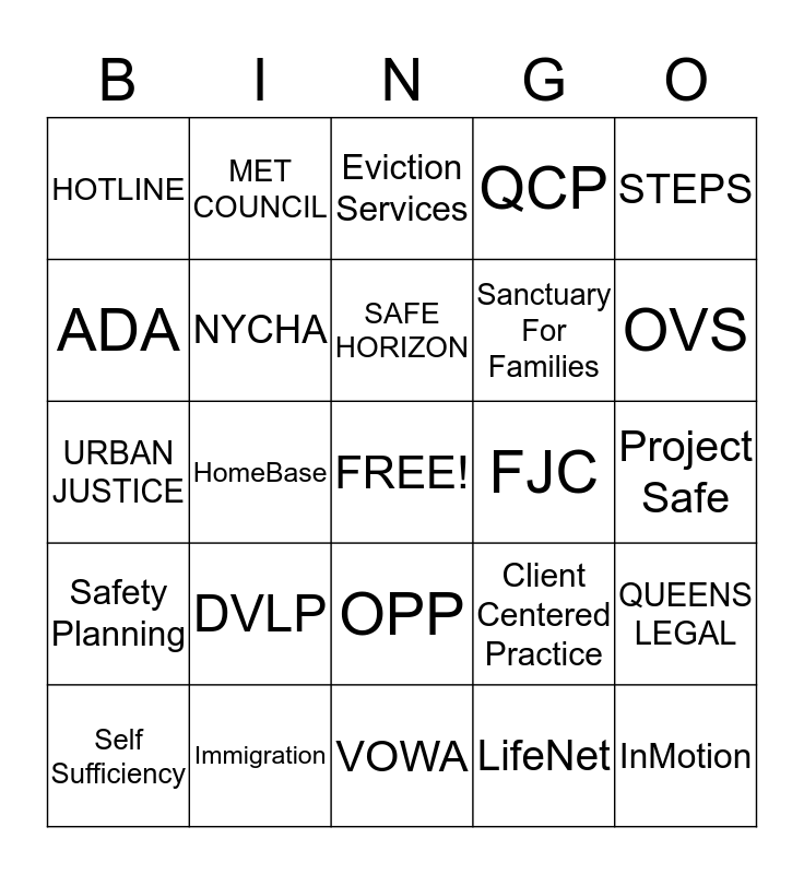 This bingo card has a free space and 24 words: DVLP, Immigration, SAFE HORIZON, Self Sufficiency, STEPS, HOTLINE, ADA, MET COUNCIL, FJC, OPP, Sanctuary For Families, URBAN JUSTICE, Client Centered Practice, QUEENS LEGAL, NYCHA, LifeNet, Project Safe, Eviction Services, OVS, HomeBase, InMotion, Safety Planning, QCP and VOWA.