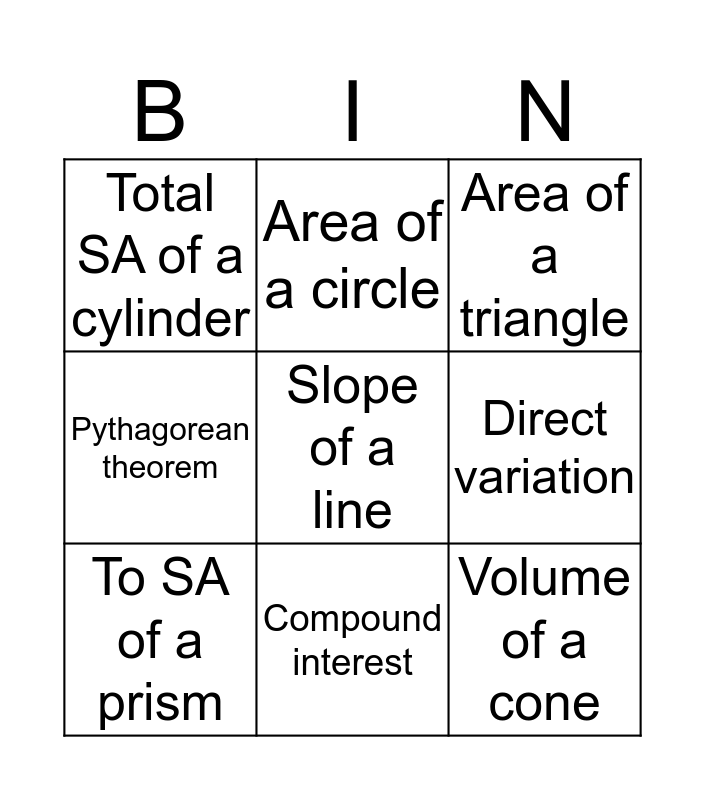 This bingo card has a free space and 8 words: Direct variation, Area of a triangle, Area of a circle, To SA of a prism, Total SA of a cylinder, Volume of a cone, Pythagorean theorem and Compound interest.