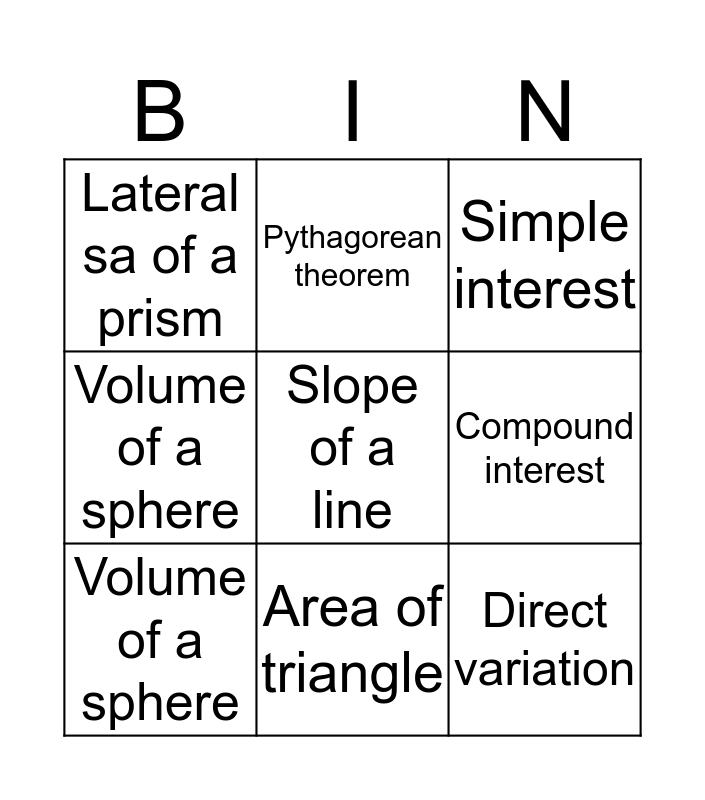This bingo card has a free space and 8 words: Compound interest, Simple interest, Pythagorean theorem, Volume of a sphere, Lateral sa of a prism, Direct variation, Volume of a sphere and Area of triangle.